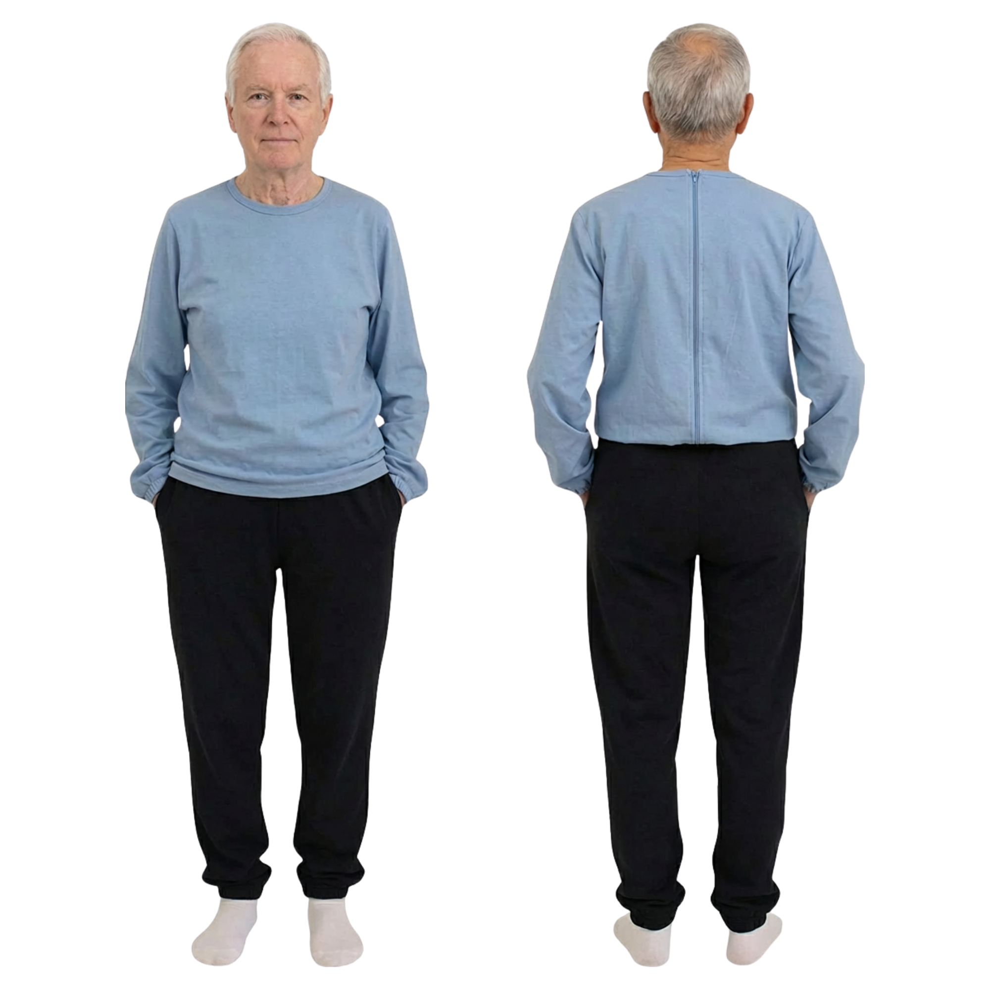 Der Anzug ist mit einem Reißverschluss am Rücken ausgestattet, der es ermöglicht, ihn zu öffnen, ohne dass er von älteren Patienten oder Personen mit psychischen Erkrankungen wie Alzheimer/Demenz versehentlich ausgezogen wird.
