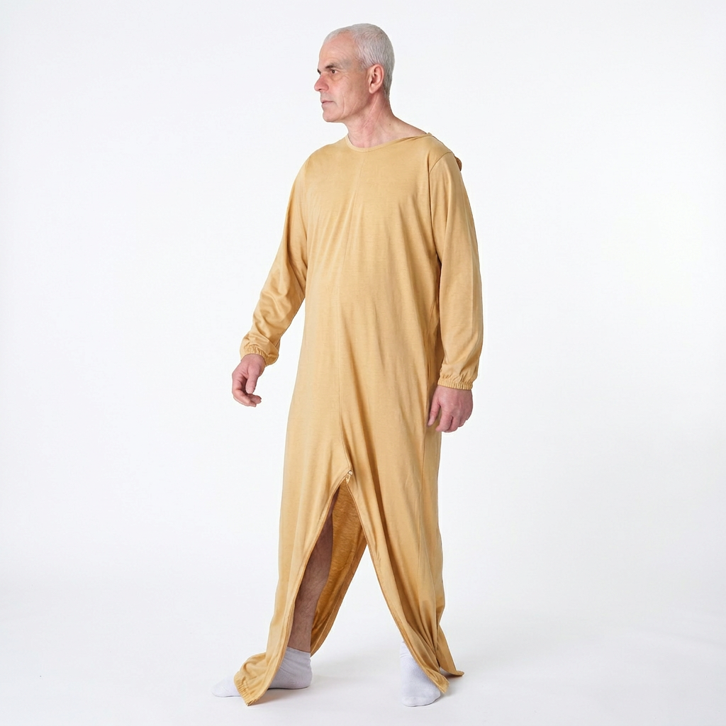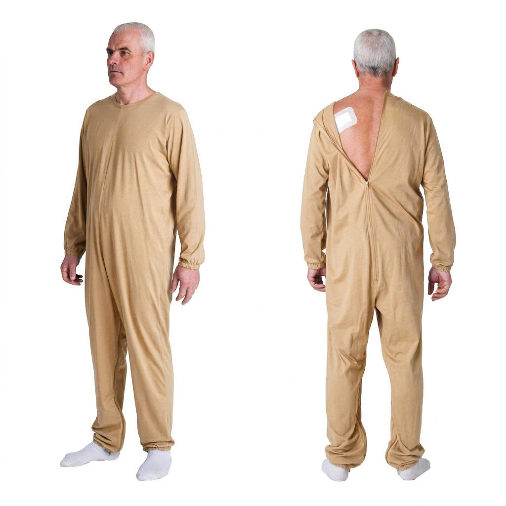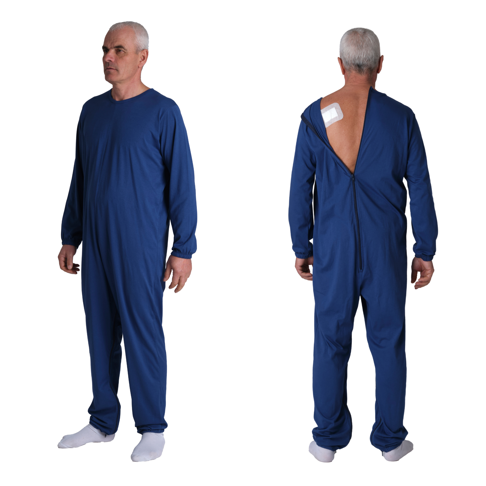 Pigiama sanitario consigliato a chi ha problemi di incontinenza e/o insofferenza agli indumenti, causa Alzheimer, demenza senile o disabilità psichica.