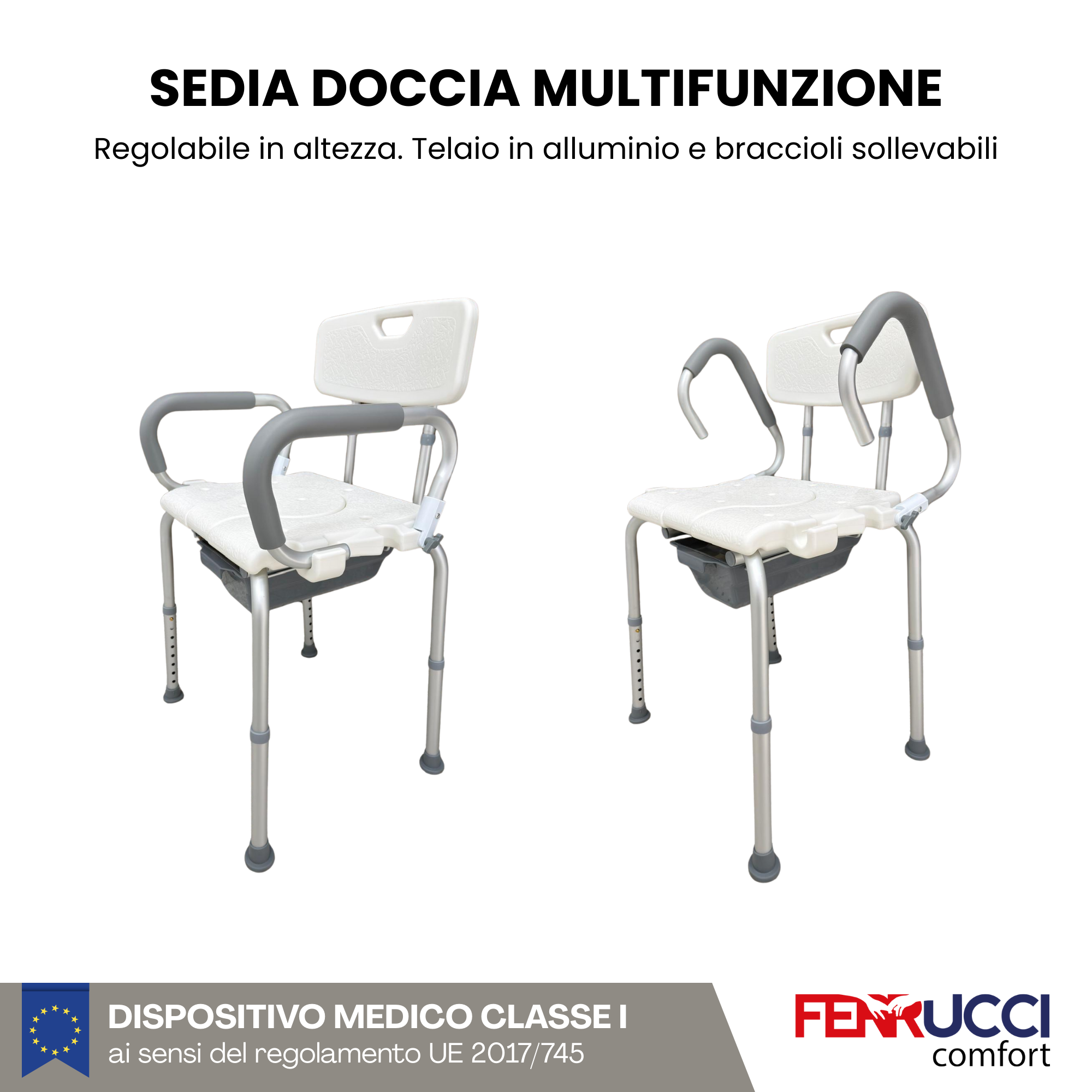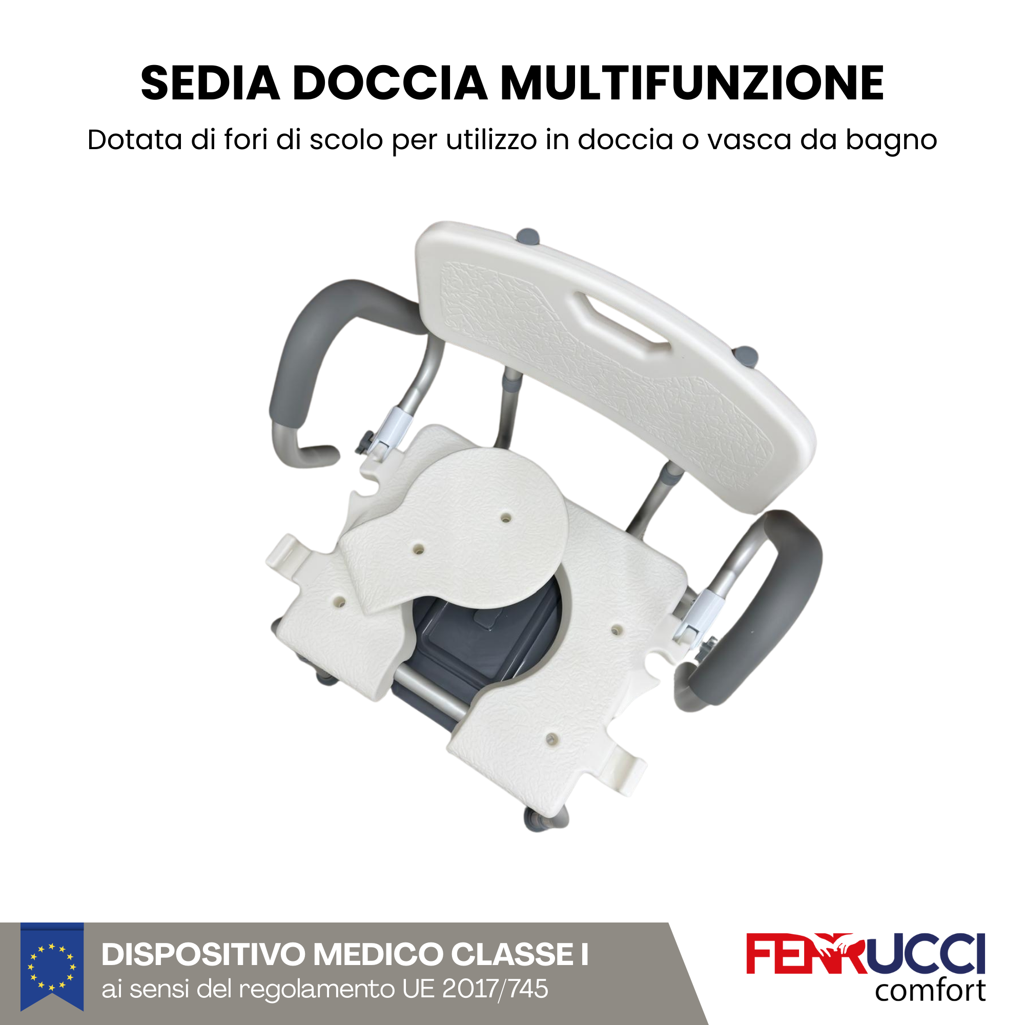 La sedia da doccia e comodo wc multifunzione di Ferrucci Comfort, garantisce sicurezza, stabilità e comodità durante le quotidiane operazioni di pulizia in doccia o vasca da bagno. Resistente alla corrosione e all'acqua. Grazie alla sua versatilità sarà utilizzabile anche come sedia wc (sacchetti igienici non inclusi).