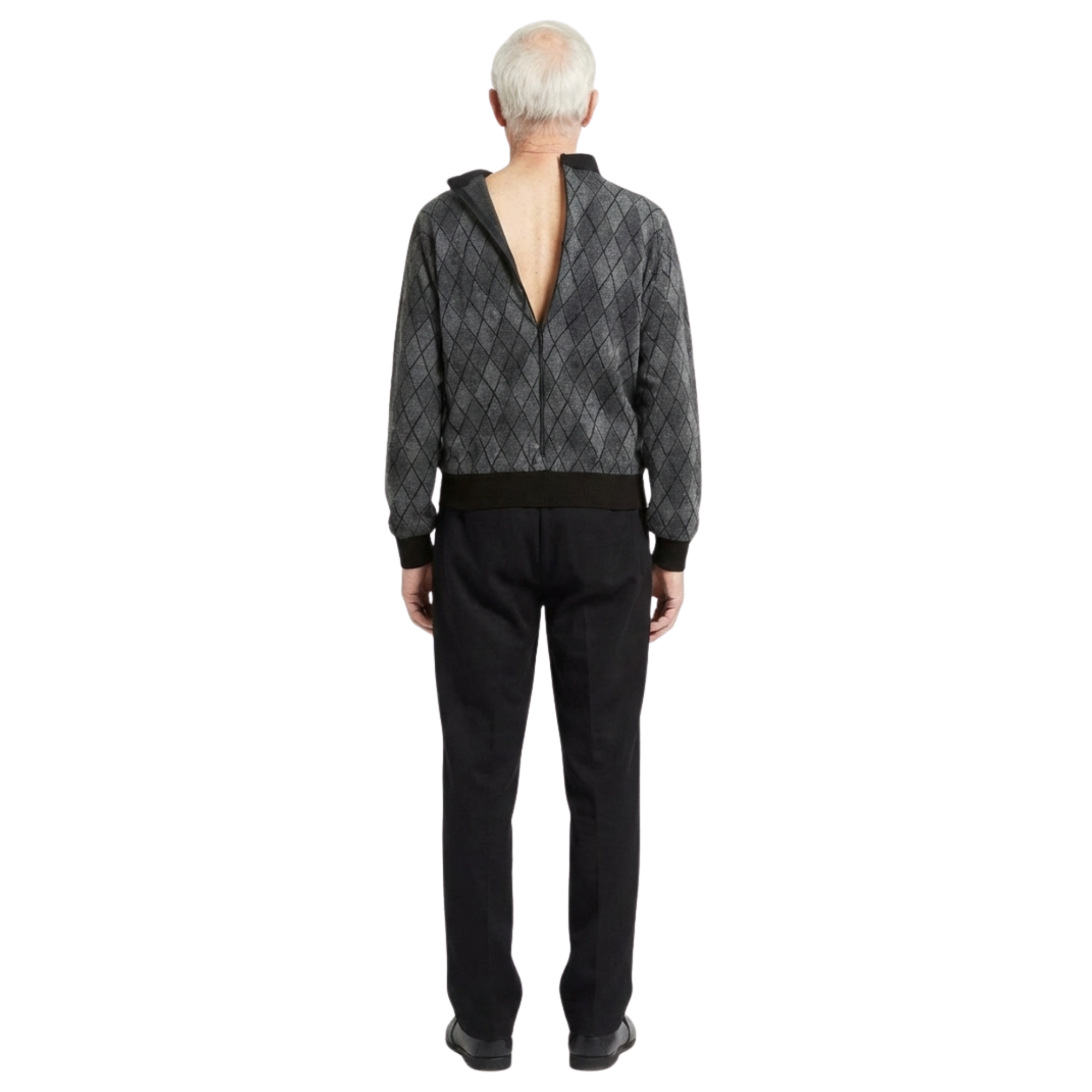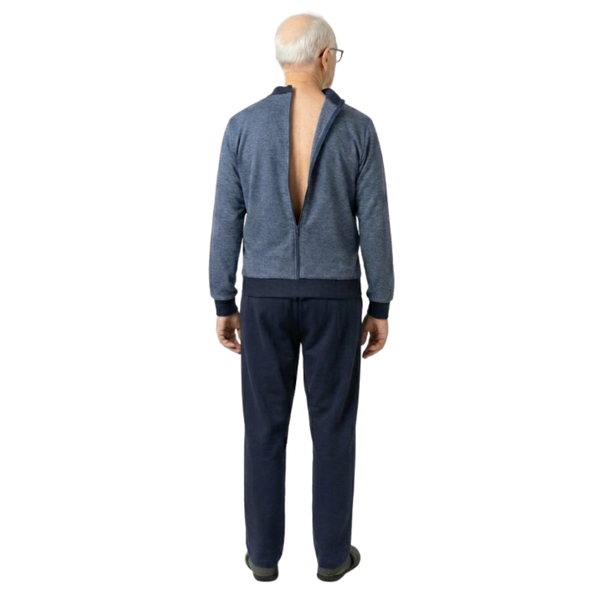 Questo capo è progettato per unire l'estetica di un completo casual alla funzionalità di un dispositivo sanitario. Pur presentandosi visivamente come un doppio capo (pantalone e felpa), si tratta in realtà di una tuta monopezzo che impedisce l'apertura autonoma da parte del paziente. La struttura è completata da pratiche tasche laterali e da una robusta cerniera posteriore posizionata sul dorso, che garantisce al caregiver il massimo controllo e al paziente una totale dignità estetica durante le uscite.